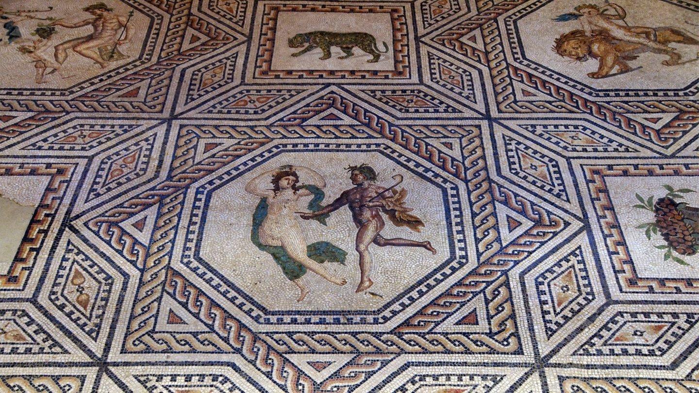 Dans la Maison de Silène, une grande mosaïque multiplie les scènes : Silène (vieux compagnon de Dionysos) au centre, entouré d’un foisonnement d’animaux, d’amours vendangeurs, de vignes et de détails “surprenants” qui donnent un côté vivant et presque narratif au décor.